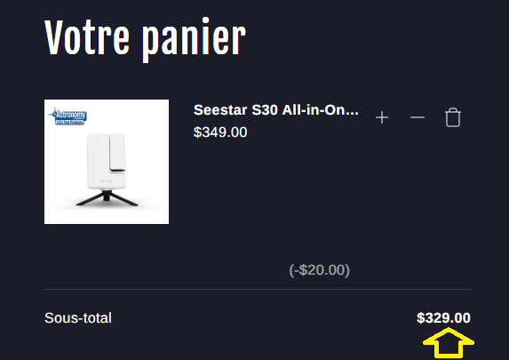 La réduction sur le site de Seestar est à 349$ mais avec notre code promo, il sera à 329$.